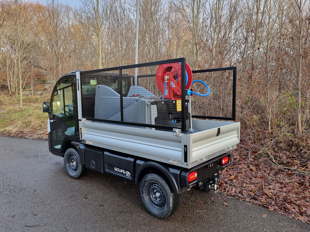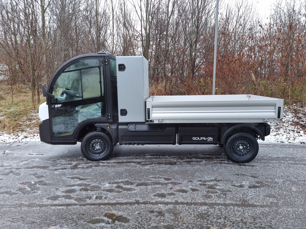 Goupil G4 har många påbyggnadsalternativ, som standard finns lastflak med lämmar, tippbart lastflak, skåp, högtömmande containerlösningar, verktygsskåp och högtrycksutrustning. En ultimat lösning för er som söker ett litet, modernt och robust elfordon.